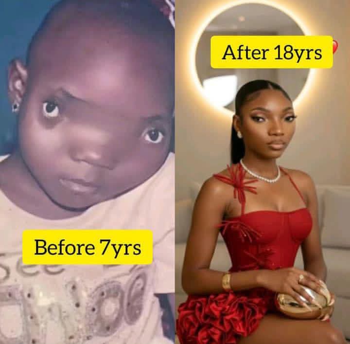 The photos she shared tell a striking story of change. In the recent images, she is dressed in a red outfit, and many who knew her in the past say they can barely recognize her. Reports surrounding her story suggest that she underwent major plastic surgery to correct facial features she had been dealing with since birth. The surgery has transformed her appearance, and she is now being described as an adorable woman attracting attention from many.